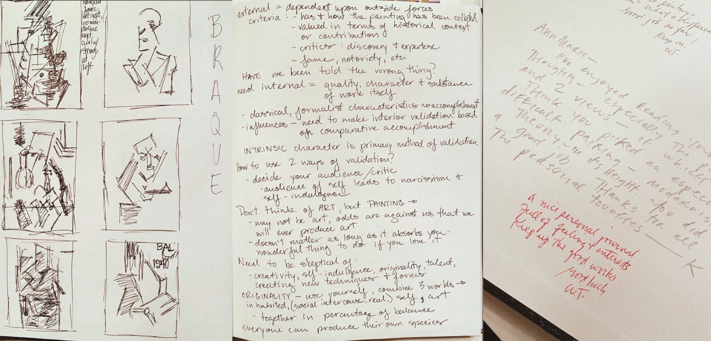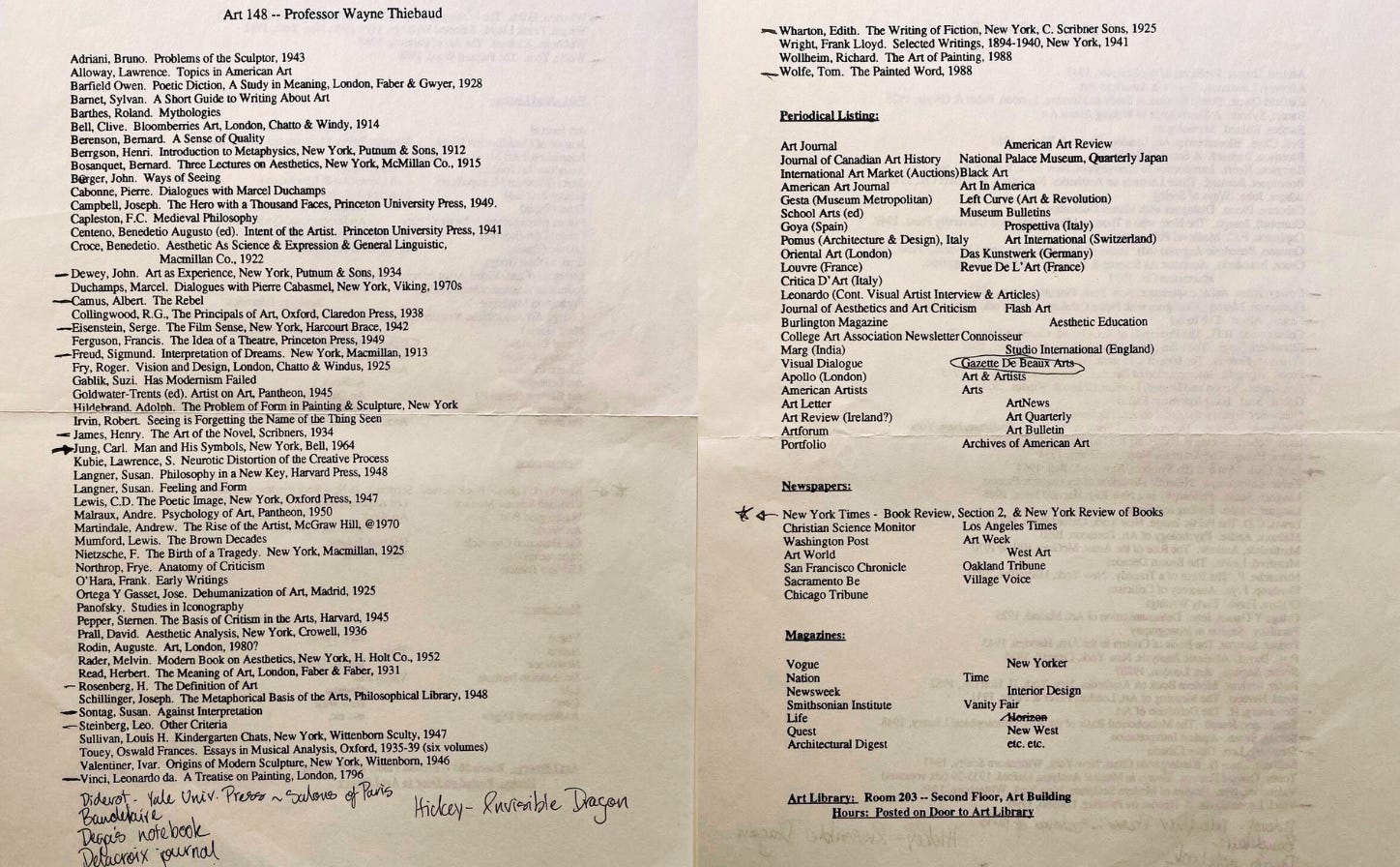 Wayne’s class was mind-blowing. He would arrive in a navy blazer and bow tie most days, and would spout all kinds of contemplative ideas. “Visual power sustains joy,” “aesthetic experience is apart from function; [there is an] eternal relationship in forms,” “paintings are flat, still and silent - animated only by you and your physical empathy,” and when discussing art: “know why you like it - specifics of engagement encourage a kind of dialogue”. When I read through this class notebook from 1996 for the first time today I couldn’t believe it. (I also couldn’t believe I’d hand-written 4 ½ pages for my final paper on modernist theory, comparing Clement Greenberg and Harold Rosenberg. I’d even thrown in a bit of Samuel Johnson’s dialogue from “Rasselas”. What an insufferable 19-year-old jerk I was.) Wayne would sometimes rush through slides of art to test us on how quickly we could sketch them, or other times would just play recordings of Fats Waller, The Beatles, or Mel Brooks’ “2000 Year Old Man”. Even looking at an image upside down was encouraged. It all could generate the kernel of some kind of something.